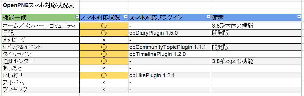 第1弾にあたる今回は、OpenPNE3.8系スマートフォン対応状況を以下の表に一覧化しました。
