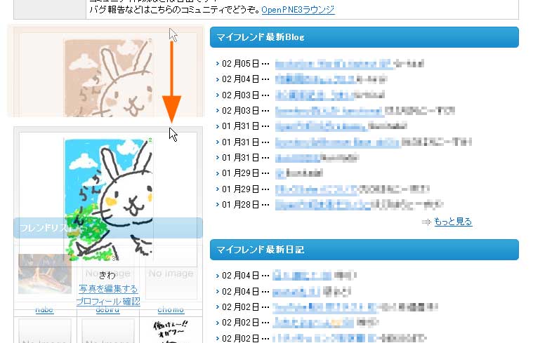 ホームにあるプロフィール画像や最新日記などの位置が自分好みに変更できるようになりました!マウスでドラッグするだけで簡単に位置を変更することができます。
