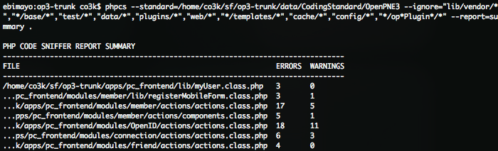 このツールには前々から興味があったのですが、 OpenPNE3 ではちょうど先日 コーディング規約を作ったばかり なので、この機会に PHP_CodeSniffer で OpenPNE3 標準コーディング規約のチェックがおこなえるように、ルールファイルを作ってみました。