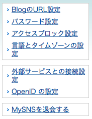 まず、 SNS の設定変更画面 (/member/config) にアクセスします。メニューに「外部サービスとの接続設定」という項目があるので、それをクリックします。
