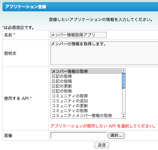 アプリケーション情報の登録を促されるので、必要な情報を入力します。使用する API は、アプリケーションが使用する予定の API をすべて選択します。ここで選択されなかった API は使用することができません。