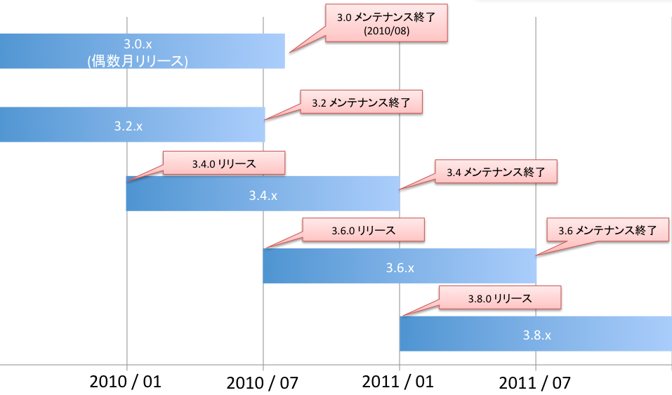 3.0.x は偶数月第 3 木曜日にリリースをおこない、本日より半年以上経過した 2010 年 8 月のリリースを最後にメンテナンスを終了します。