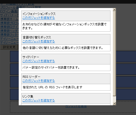 どーん!クリックするとカッコイイ感じにガジェット追加画面が登場。「RSSリーダー」や「リンク集」が選択肢にでてくるので、好きなものを選択しましょう。今回はRSSリーダーを選択します。
