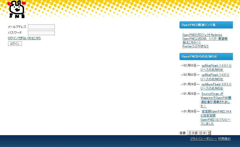 そのままだとHTML挿入にOpenPNE2の「利用規約」「プライバシーポリシー」が残ると思うので、忘れずサクッと消しましょ~。