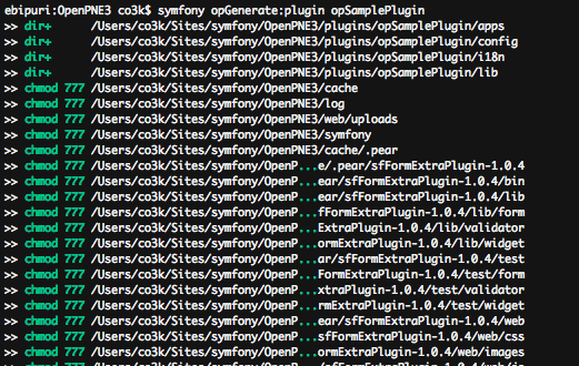 opGenerate:plugin の実行をおこなうことでプラグインの生成をおこない、 opGenerate:app や opGenerate:module コマンドを実行して機能実装のためのひな形となるファイルを作成していきます。