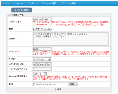 また、この画面で「Redmine 使用設定」を「使用する」にすると、OpenPNE Redmine にプラグインのプロジェクトが自動で作成されます。
